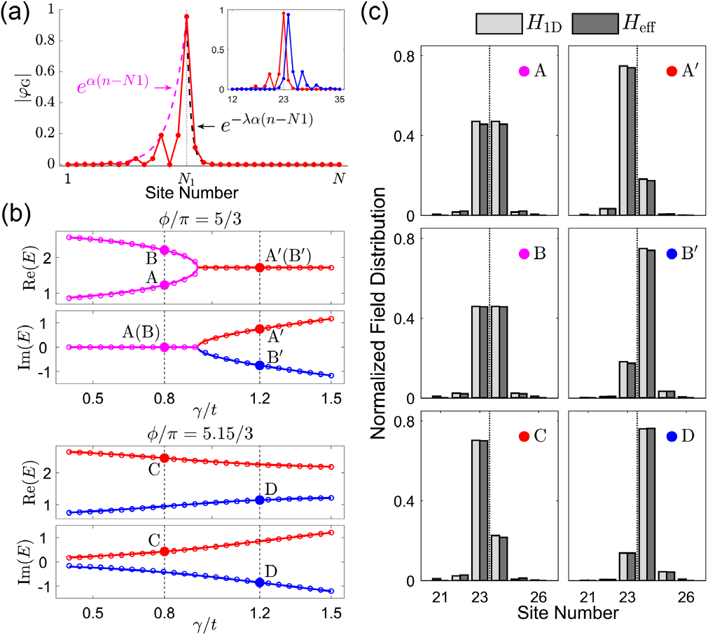 Fig. 1 (a) Schematic plot of constructing φ. (b) Comparison of eigenvalues and (c) normalized field distributions of domain-induced edge states given by H_1D and H_eff.
