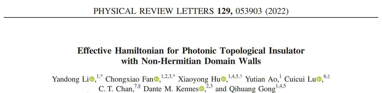 Yandong Li, Chongxiao Fan, Xiaoyong Hu,* Yutian Ao, Cuicui Lu*, C. T. Chan,* Dante M. Kennes, and Qihuang Gong, Effective Hamiltonian for Photonic Topological Insulator with Non-Hermitian Domain Walls, Physical Review Letters 129, 053903 (2022).