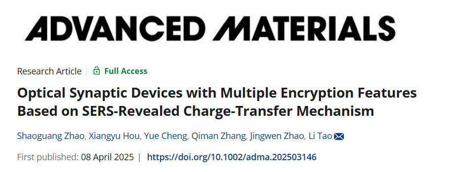 近日,威廉希尔中文官方网站姚裕贵教授团队成员陶立教授课题组在Advanced Materials发表了一项重要研究成果,题为“Optical synaptic devices with multiple encryption features based on SERS-revealed charge-transfer mechanism”。具有原子级厚度的二维材料光学突触器件表现出构建高度集成的可调谐人工视觉神经网络的潜力。然而,原子级厚度也会导致光吸收较弱,限制了器件的光电性能。该研究提出的罗丹明6G染料(R6G)/InSe杂化结构器件展现了优异的光响应及光电突触性质,并从光谱学和光电子器件两种视角,证明了染料分子和二维InSe之间的电荷转移机制。通过表面处理有效调控了电荷转移的过程,并基于此实现了双重光学加密防伪应用。