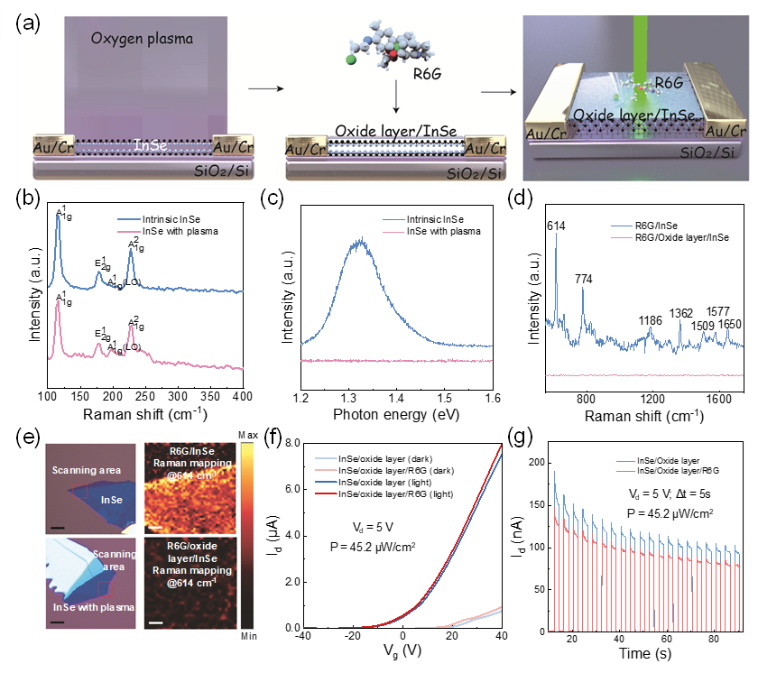 为进一步验证电荷转移机制,团队采用温和氧等离子体处理的方式在InSe表面诱导了超薄自限氧化层,用于隔绝电荷转移通路。这种方式引入的氧化层可以最大限度减少实验过程对材料本身的影响。氧化层引入之后,用R6G掺杂氧化层/InSe表面,发现有氧化层覆盖的InSe表面无法检测到R6G的拉曼特征峰。此外,引入氧化层之后的InSe器件在R6G掺杂前后表现出几乎相同的光电响应,说明R6G与InSe之间的电荷转移通路被氧化层阻挡,进而从光谱学和电学的角度证明了R6G与InSe之间的电荷转移机制。