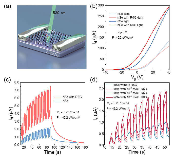 R6G除了作为探针分子之外还可用于沟道敏化剂。团队对比了R6G掺杂对InSe器件光电性能的影响。R6G的引入极大的提升了InSe器件的光响应。这是由于R6G在光照条件下会产生了大量光生载流子,这些光生载流子通过电荷转移通路转移到InSe沟道中,并在沟道偏压下参与载流子输运过程。R6G掺杂后的InSe器件的光响应提升了328.9%。此外,部分电荷被InSe的界面缺陷俘获,这使得这种混合结构器件有望用于实现光学突触应用。
